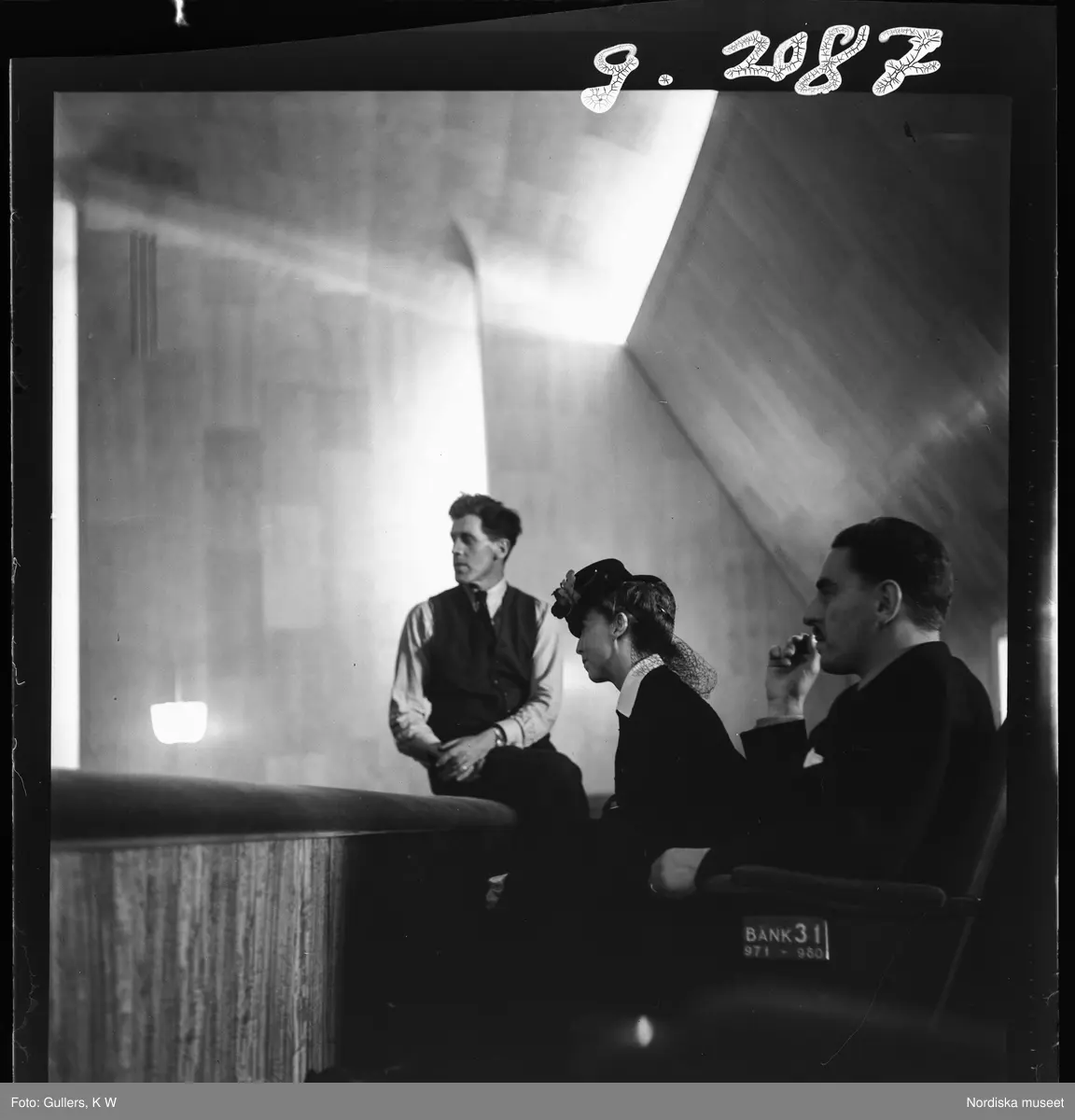 Titel: 513 Red. Karlströmer. Två män poch en kvinna betraktar något på en scen från första parkett.