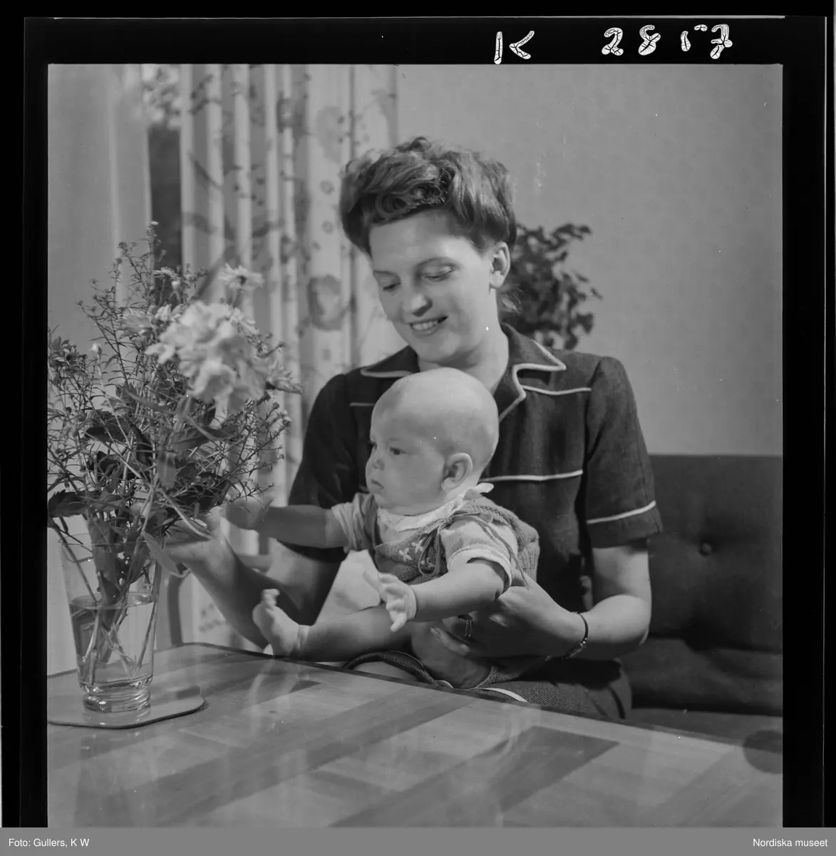 513 B Red. Karlströmer. En bebis sitter i knät på en kvinna och sträcker sig efte ren blombukett på bordet.