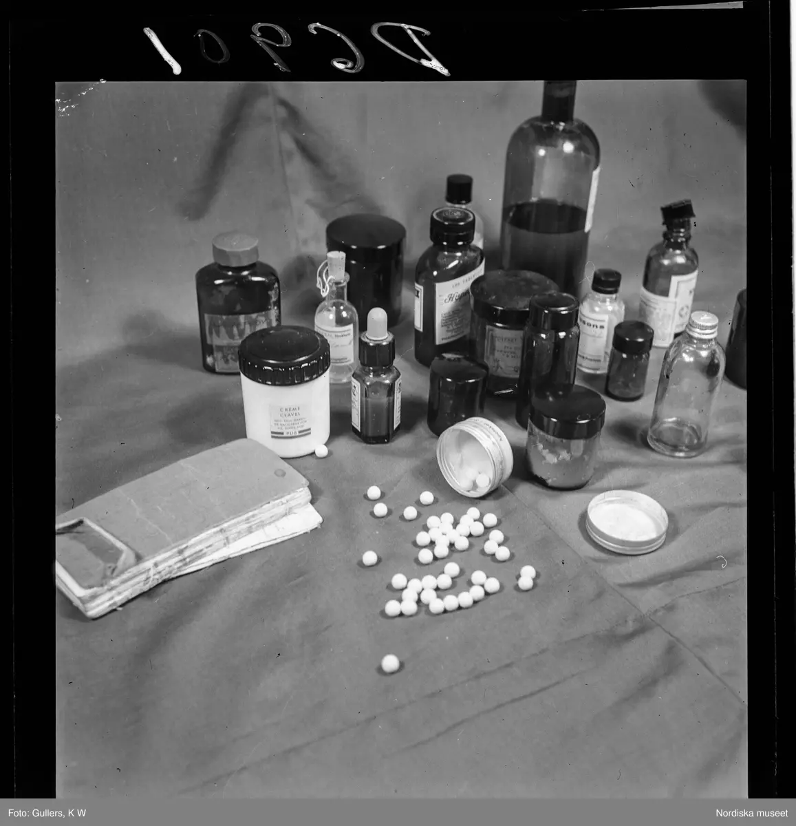 522 Kvacksalveri, Allers. Pillerburkar, flaskor och anteckningsbok.