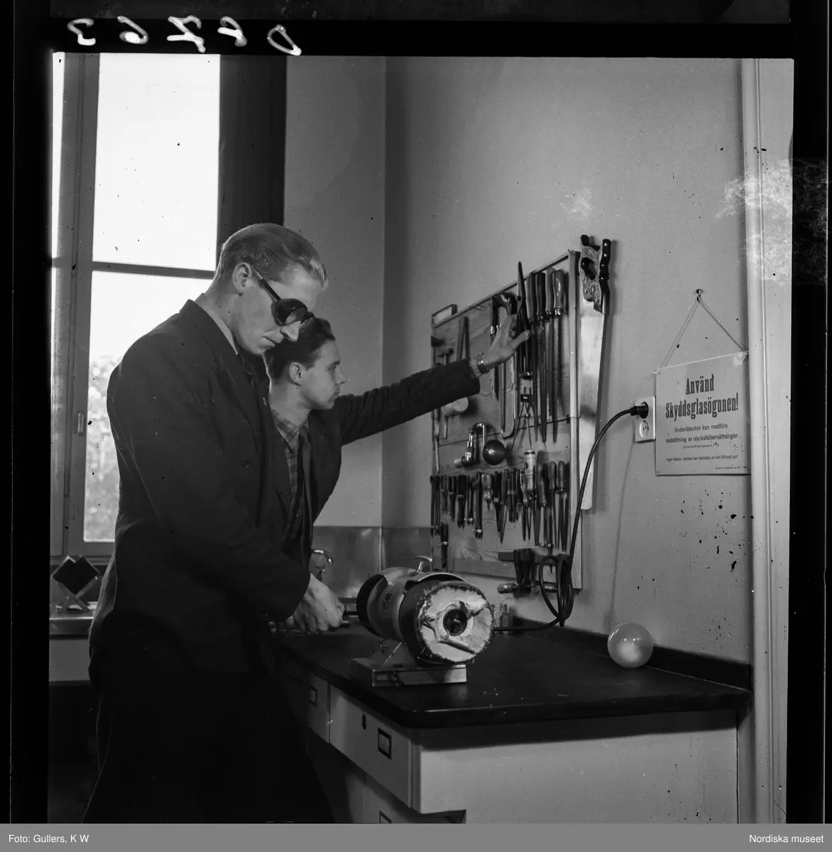 534 Polisskolan. Något slipas i en trä- eller metallverkstad. En elev håller på att ta ned ett redskap som hänger på väggen.