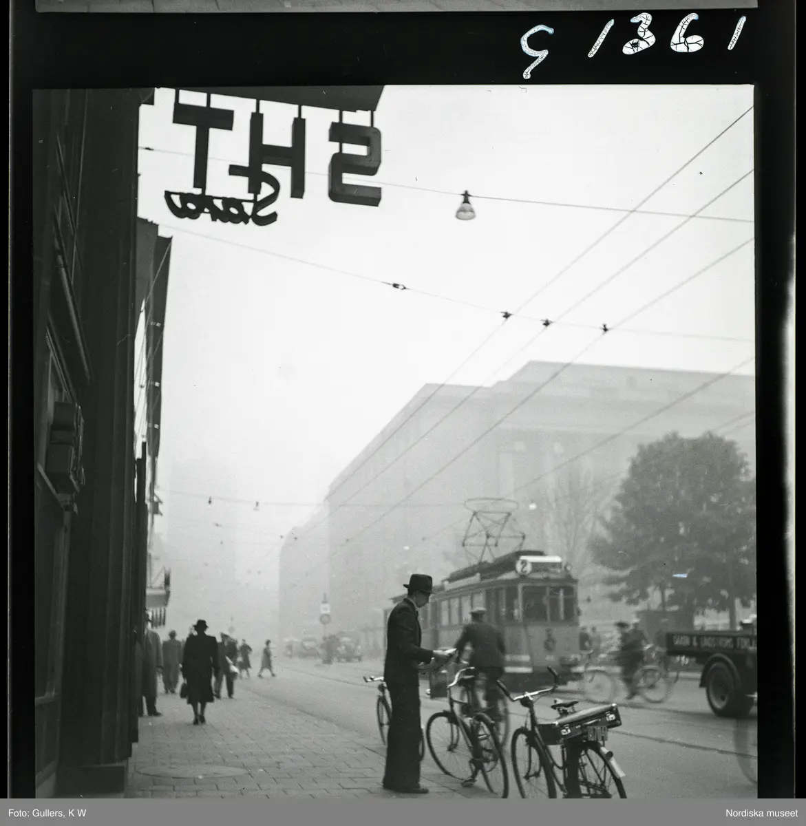 542 Dimma. Trafik på stadsgata. Spårvagnslinje 2 passerar.