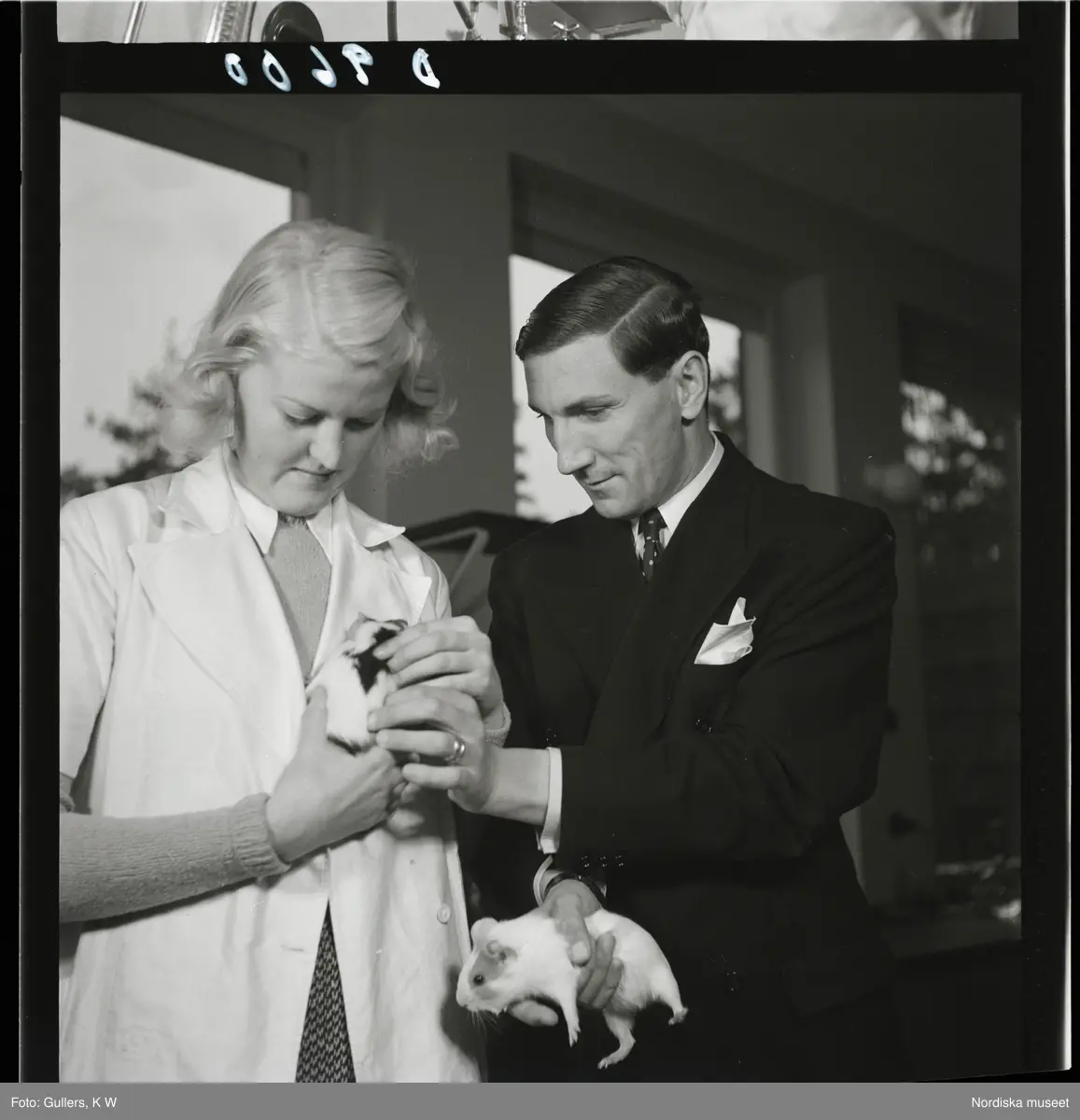 Arbete i labb vid Statens Institut för folkhälsan (myndighet verksam mellan åren 1938 - 1971). En man och en kvinna håller försöksdjur marsvin.