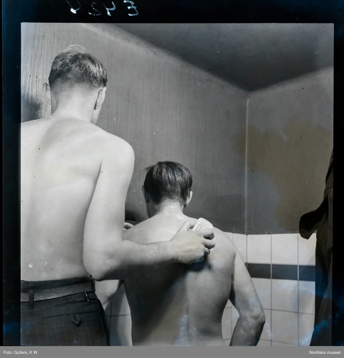577 Skrubba mig på ryggen Omslag SE. En man tvättar en annan på ryggen.