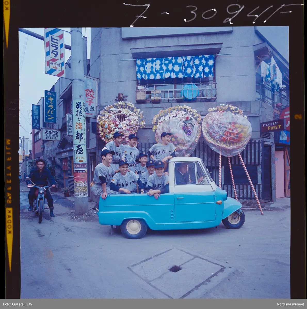 585/8 Facit Tokyo Daberg. Facit baseboll-lag poserar på flaket av en liten bil.