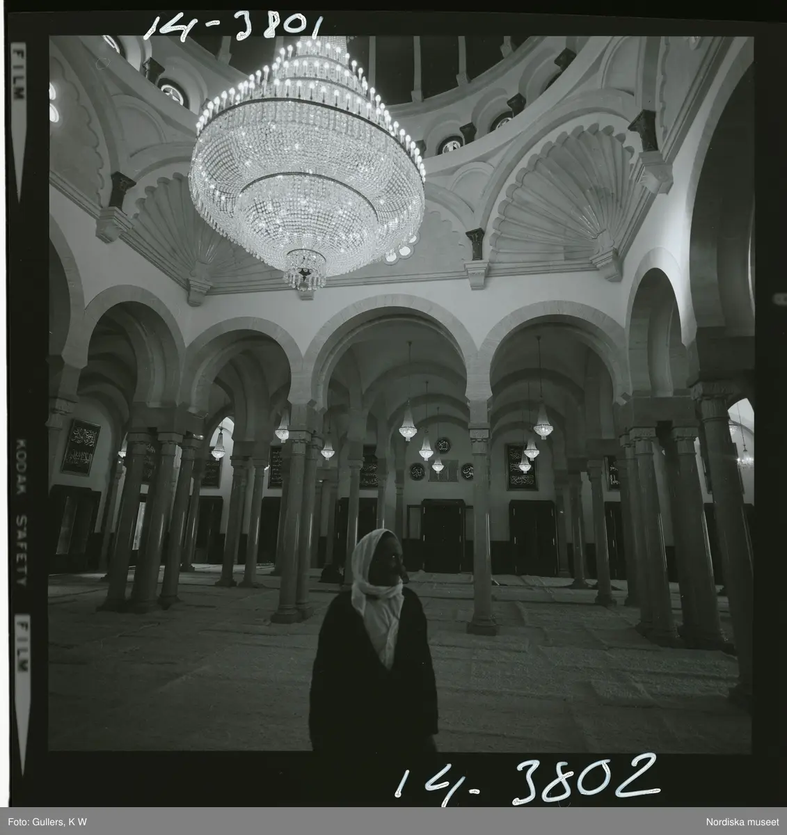 2791/1 Tunisien allmänt. En man står i en moské med en enorm ljuskrona.
