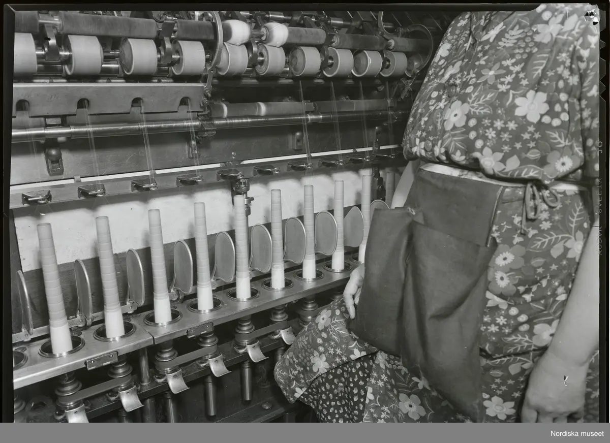 Titel: Textilindustri. En kvinna arbetar vid en vävmaskin. Dokumentation av Slitmanfabriken ABs verksamhet.