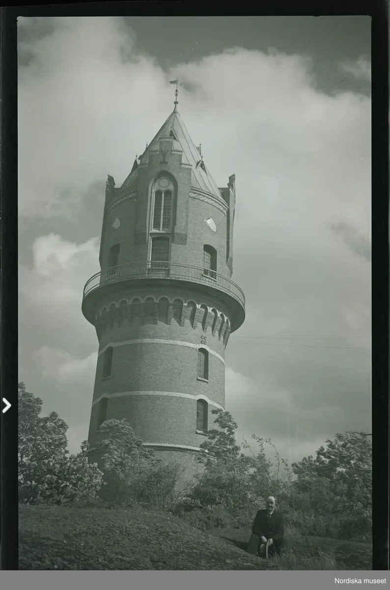 En man sittandes framför Ronneby vattentorn.