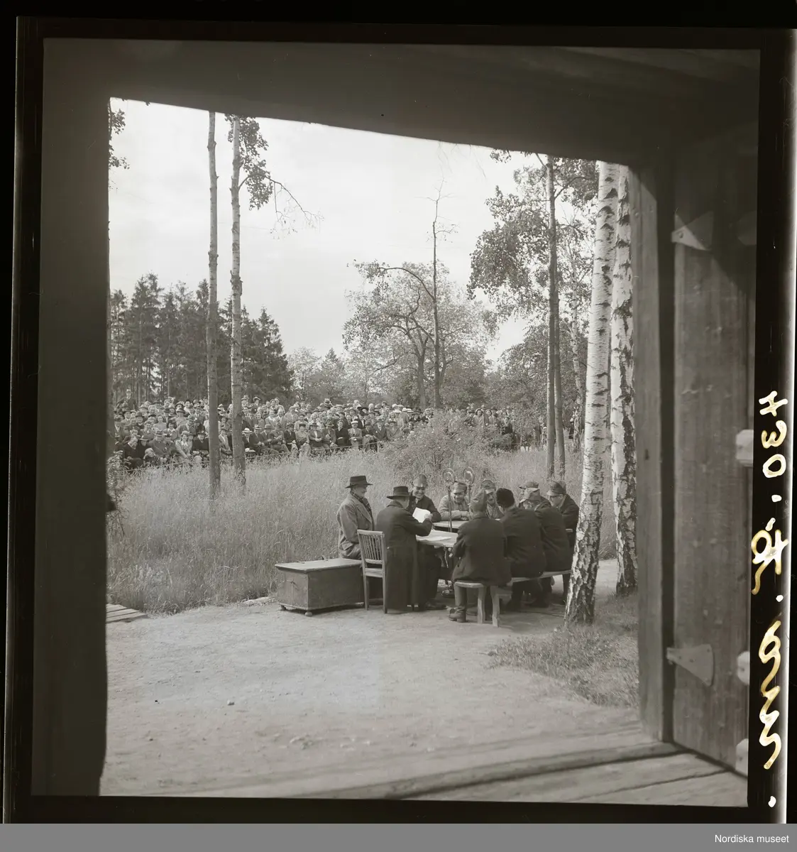 En grupp män sitter kring ett par bord uppställda utomhus på Skansen, Stockholm. Mellan dem står mikrofoner uppställda och en av männen har anteckningar framför sig. Möjligen radioupptagning/inspelning.