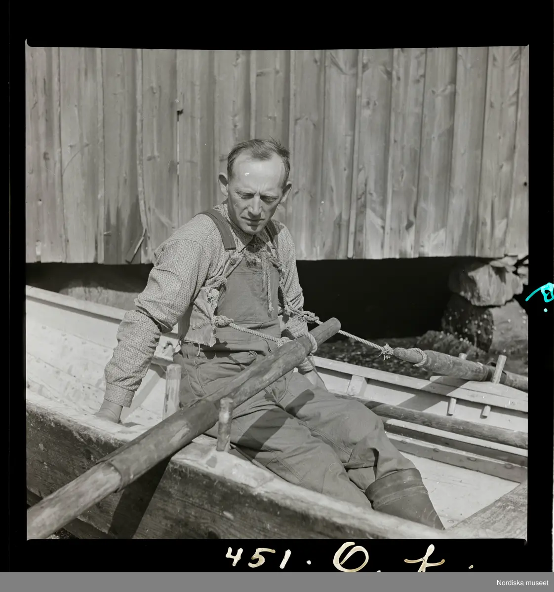 Man sittandes i eka med årorna knutna kring kroppen.