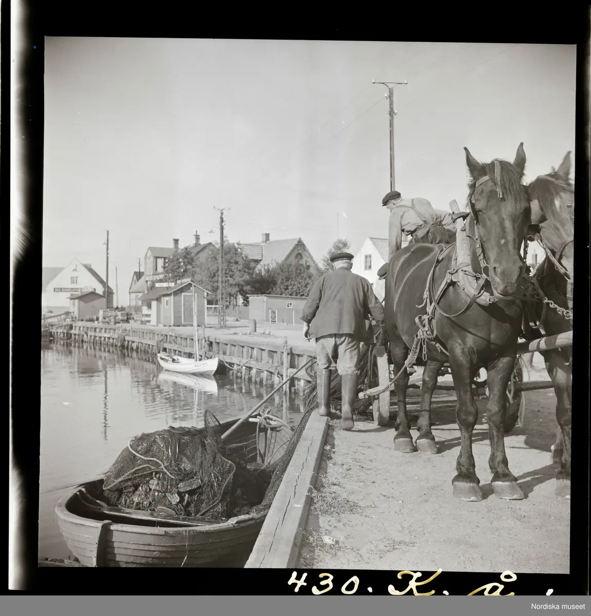 Text på montering i arkivet: Man bereder sig att hala upp det 90 famnar vida bottengarnet.