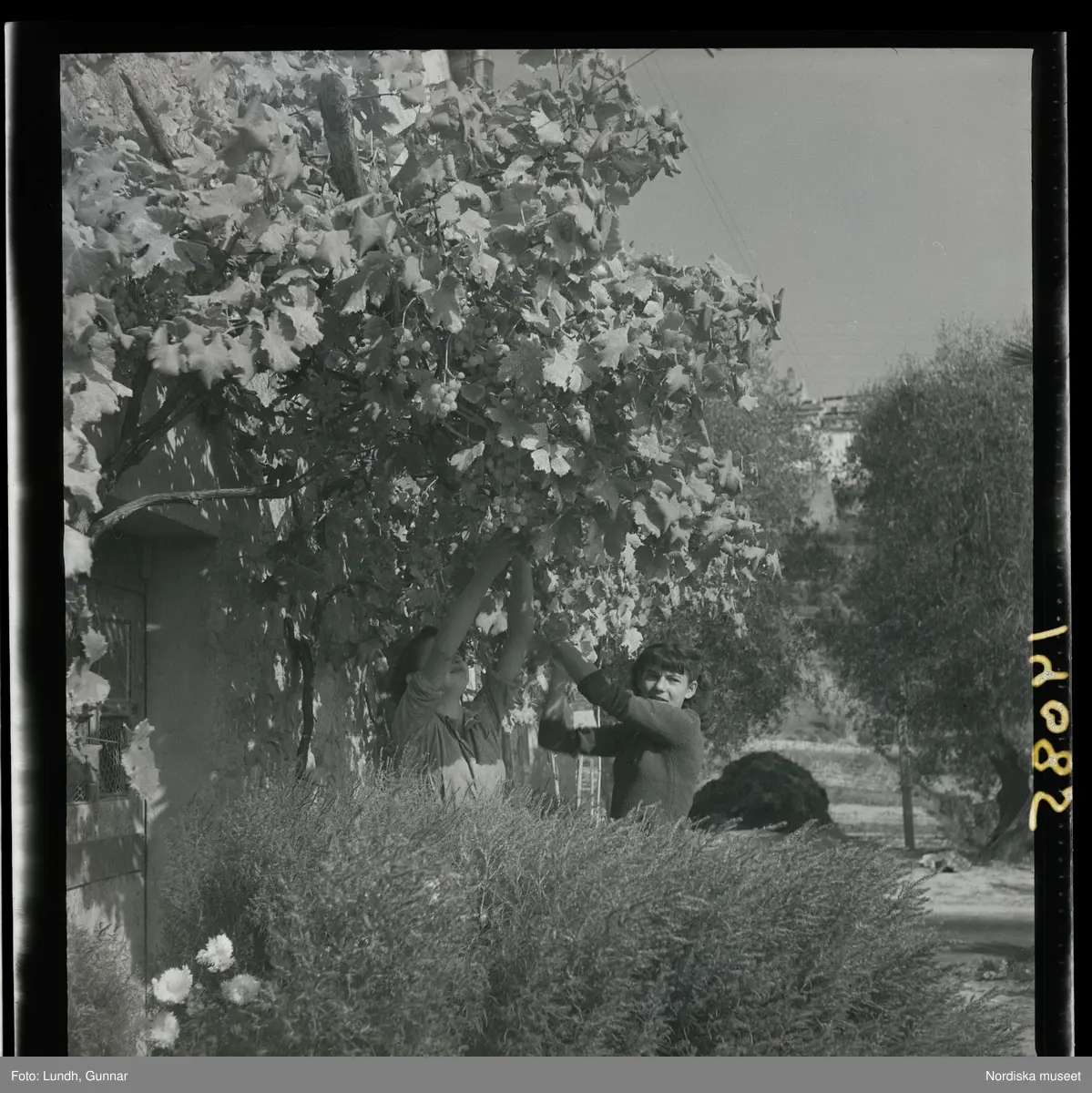1950. Frankrike. två personer skördar frukt från träd