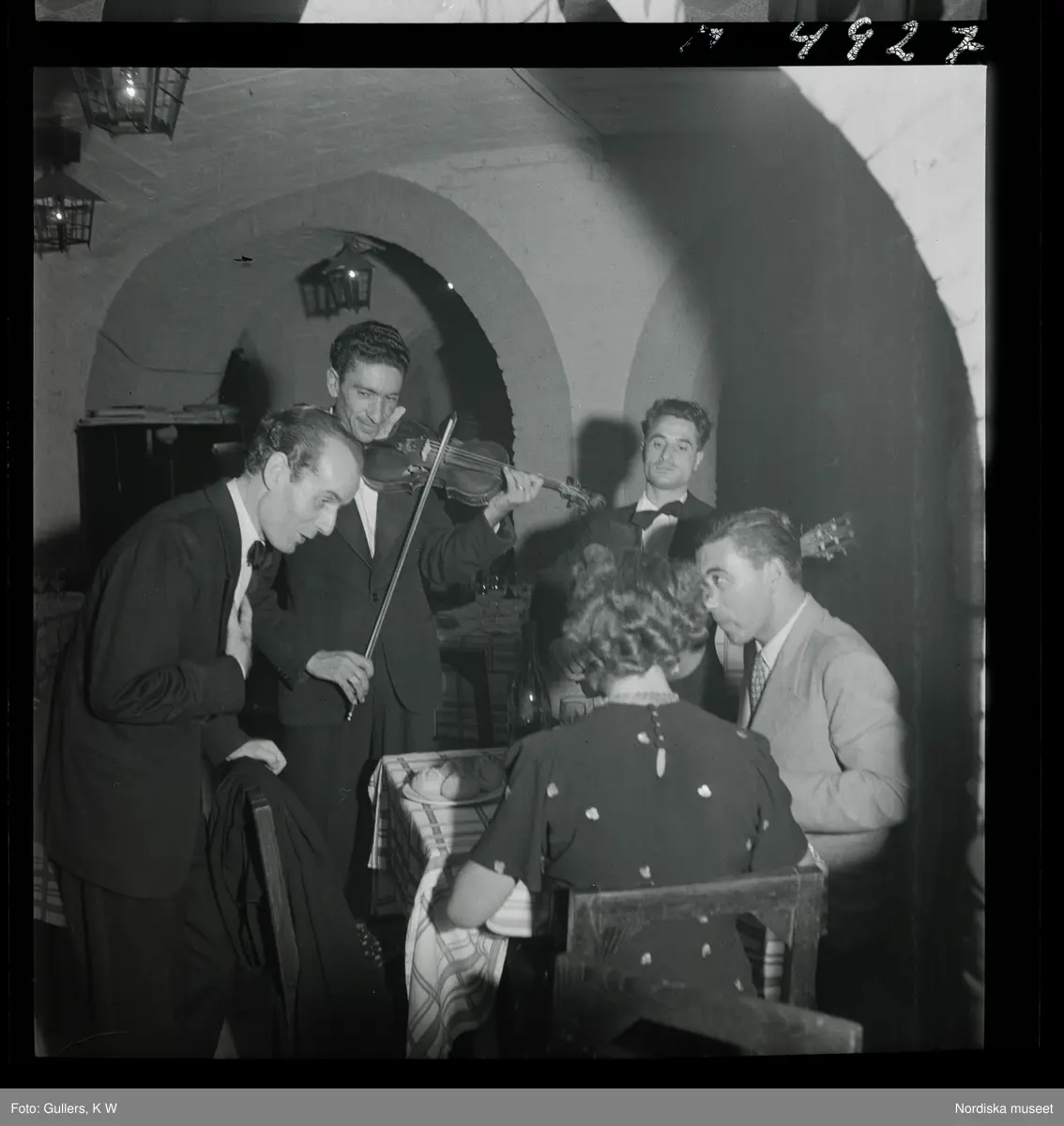 1717/A Rom. Musikanter spelar för ett par som äter middag på en restaurang.