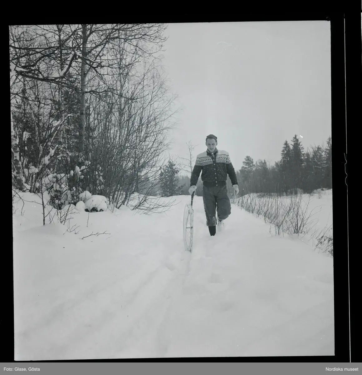 Titel: Hellasgården, Ringblom med fru på trappan samt skidåkaren Göte Andersson, 15-12-1944.