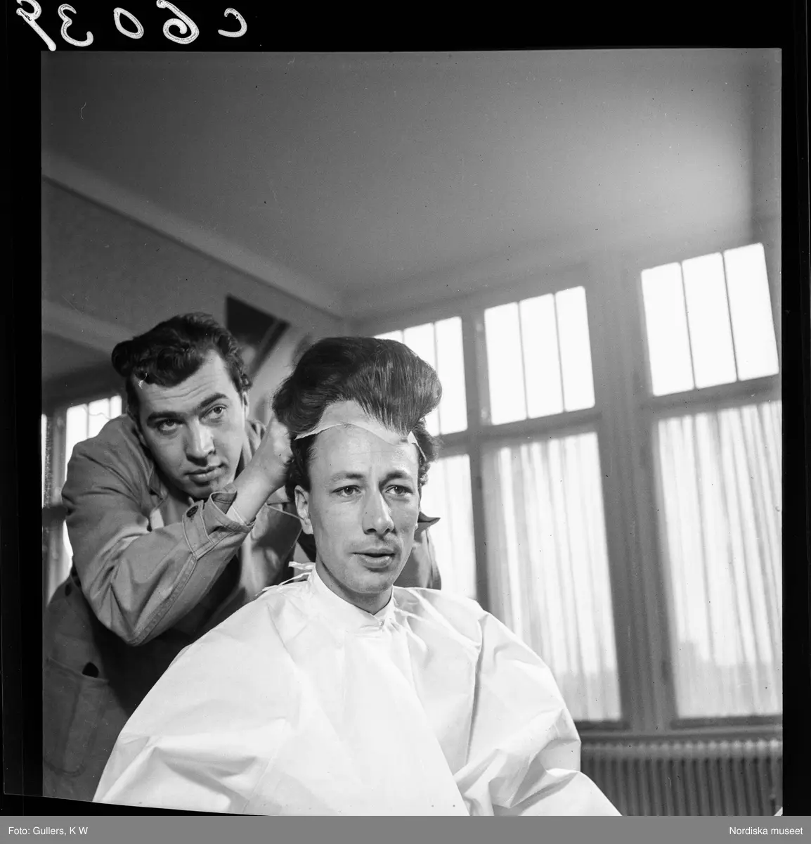 Skådespelaren Gunnar Sjöberg får hjälp av kollega med sin peruk, under föreberedelser framför spegeln i en sminkloge.