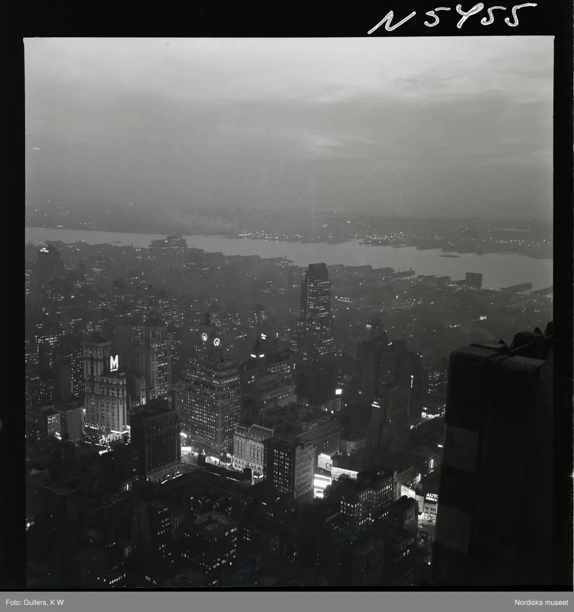 1690 New York allmänt (N.Y. Herald Tribune). Kvälls-/ nattbild. Skyskrapor.