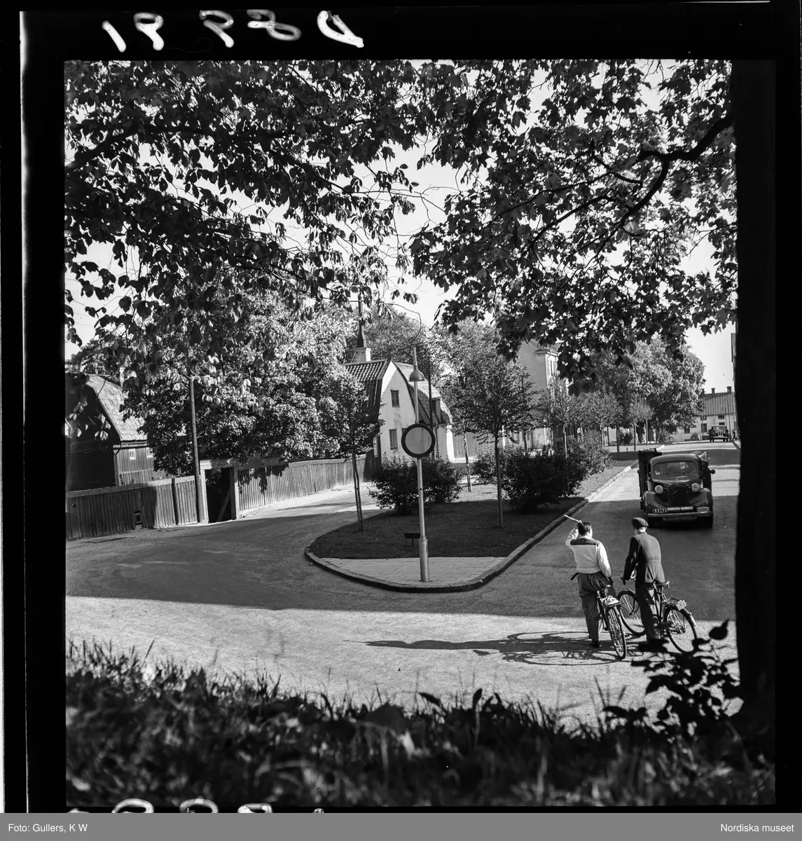 539 Söder. En lummig gata. Två män på cykel har stannat till.