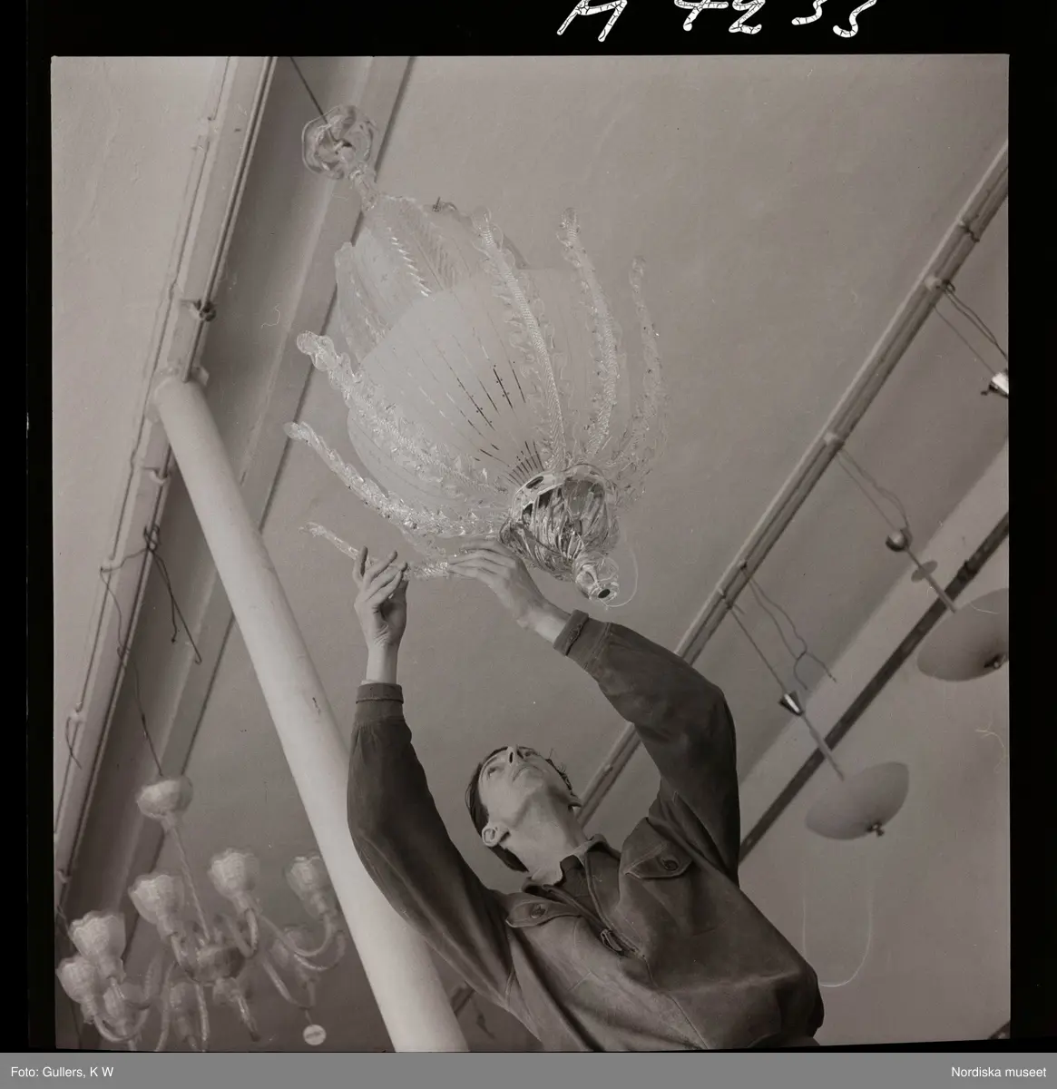 1713 Orrefors Glasbruk Ingeborg Lundin. Man justerar en hängande ljuskrona i glas.