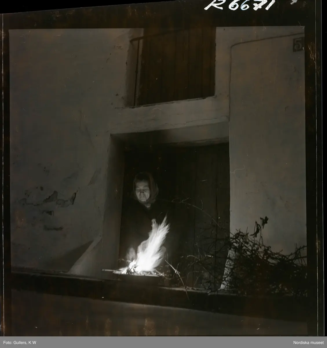 Titel: 568 F. Stieg Trenter, Torremolinos. En kvinna gör upp eld utanför ett hus.