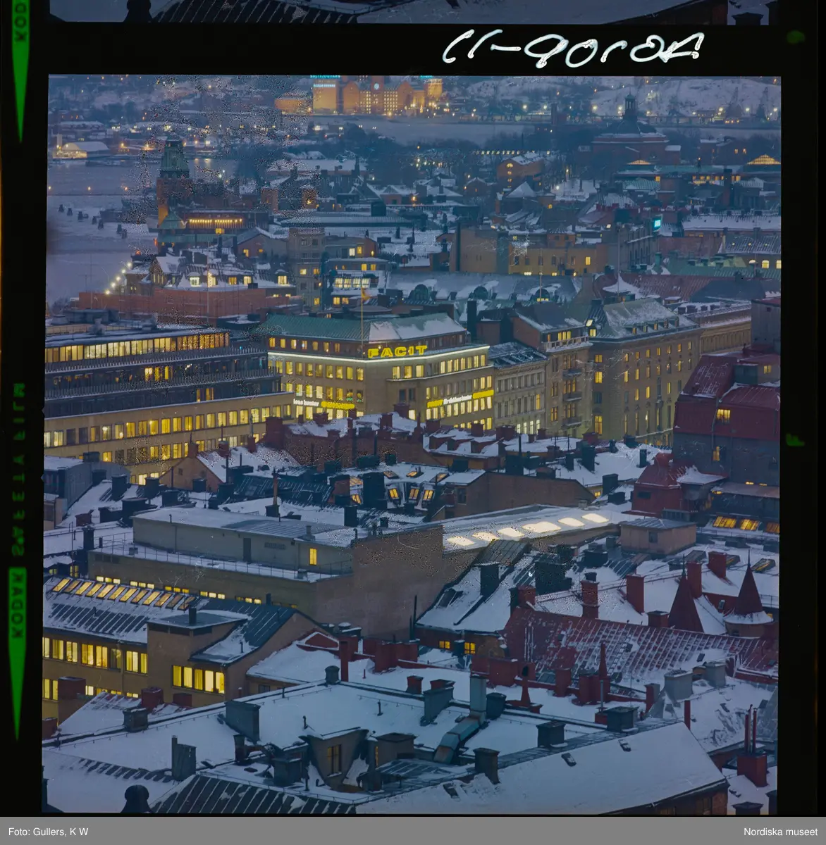 Titel: 585/40 Facit Nattbild från N.K + Södra Kungstornet. Kvällsbild. Facit-skylt på taket av fastigheten Styrpinnen 22, ritad av arkitekt Ivar Tengbom i hörnet Hamngatan / Kungsträdgårdsgatan i Stockholm.