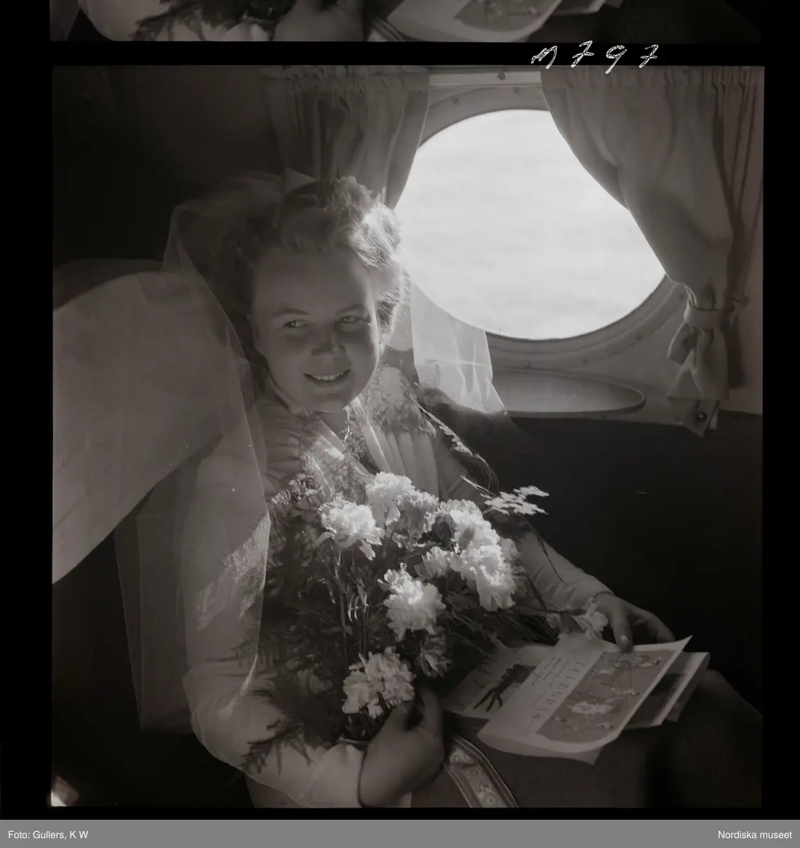 "1680 Bröllop i luften med Abas DC-4 ""Sunnan"" till Paris " En brud sitter i ett flygplan med brudbukett och telegram i famnen.