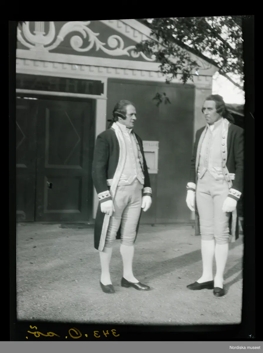 Två män i historiska kläder. Skansen, Stockholm.