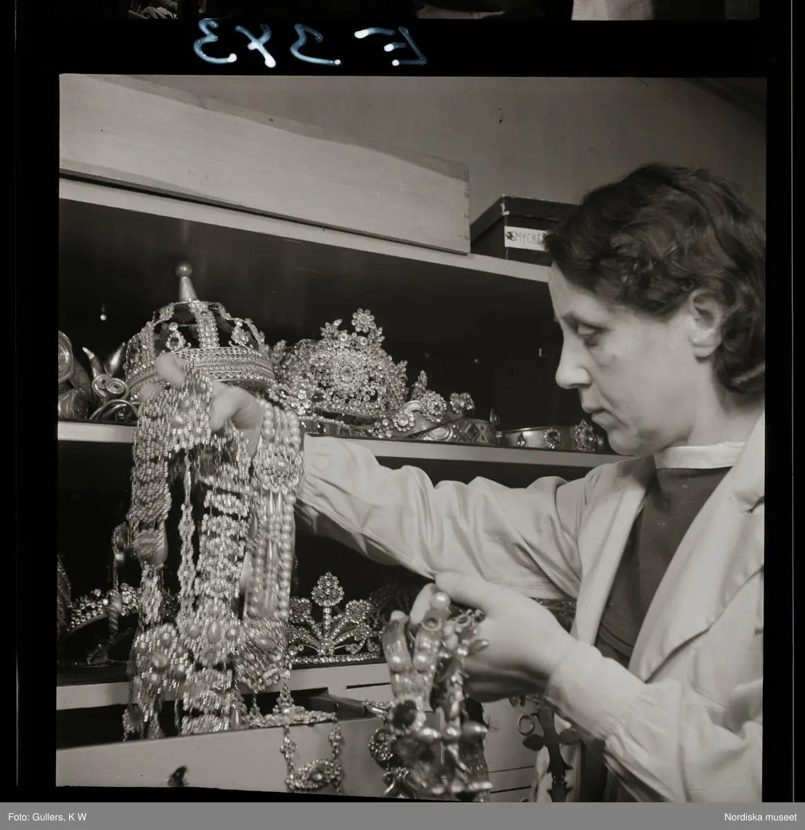 561 Operan för Allers. En kvinnlig arbetare visar accessoarer i ett skåp.