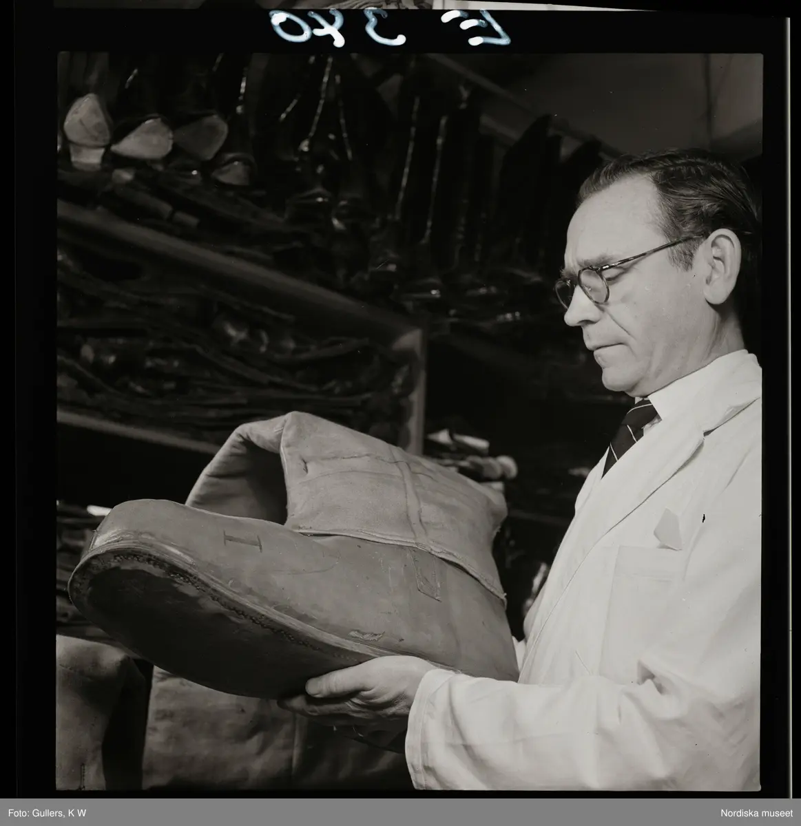 561 Operan för Allers. Kostymförråd. En man arbetar bland stövlar och skor.