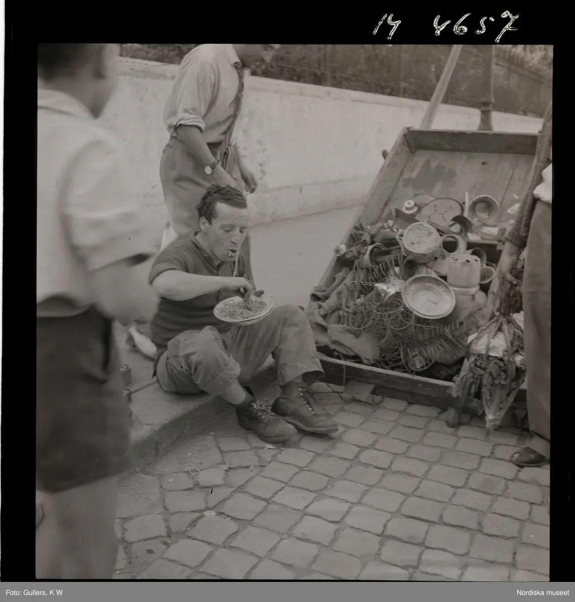 1717/B Rom. En man sitter och äter på gatan intill en kärra med skrot.