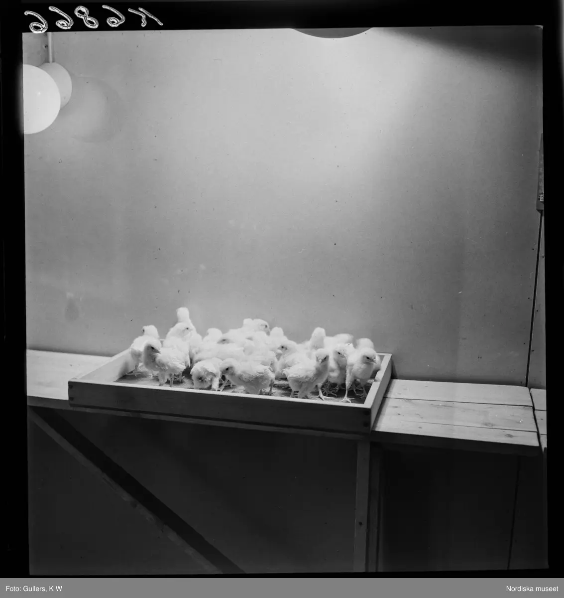 507 E Ultuna Fjäderfälaboratorium. Kycklingar på ett bord.