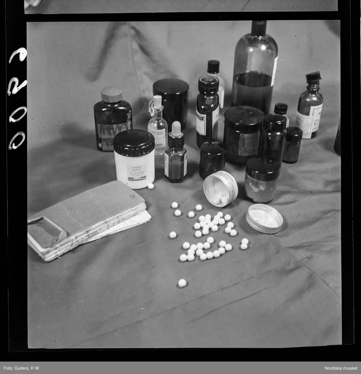 522 Kvacksalveri, Allers. Pillerburkar, flaskor och anteckningsbok.