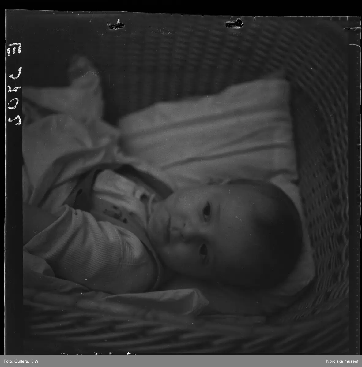 Titel: 513 Red. Karlströmer barn. Ett litet barn i sin rottingsäng/vagga.