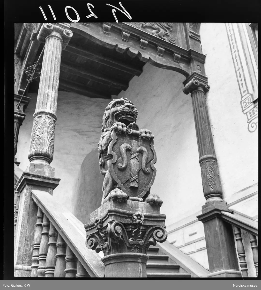 511 B Gripsholms Slott. Snidad träfigur i form av lejon med vapensköld.