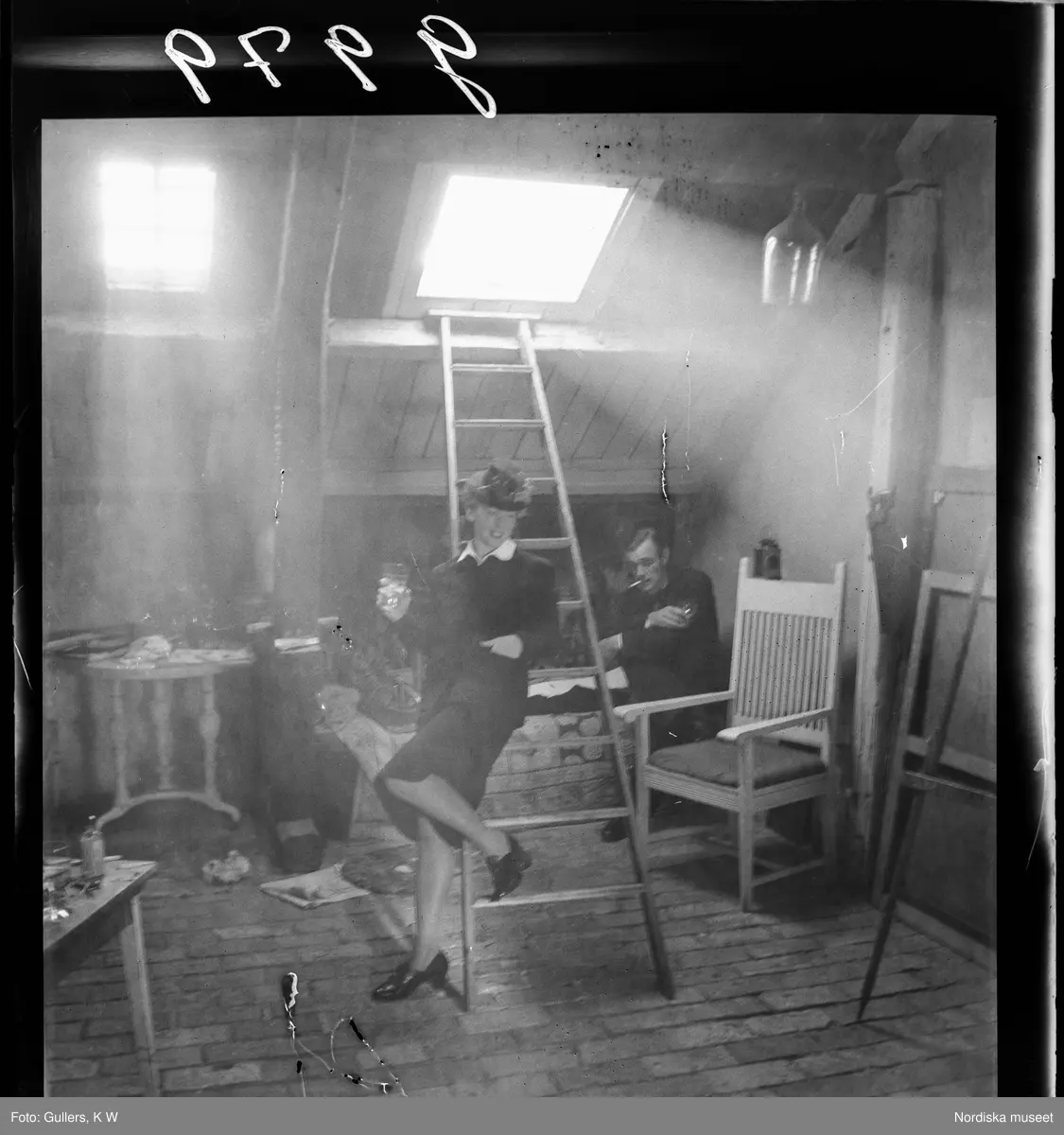 513 Red. Karlströmer. En man och en kvinna i en vindsateljé, hon lutar sig mot en stege och håller ett glas i handen.