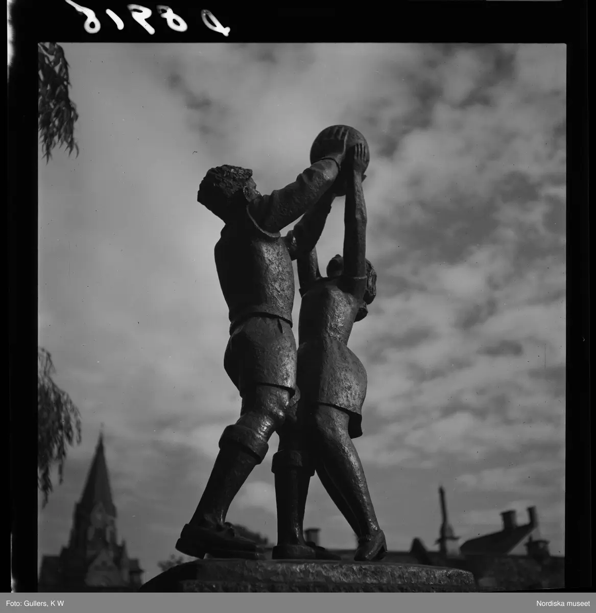 539 Söder. Offentlig konst. Staty, en pojke och en flicka håller gemensamt i en boll.