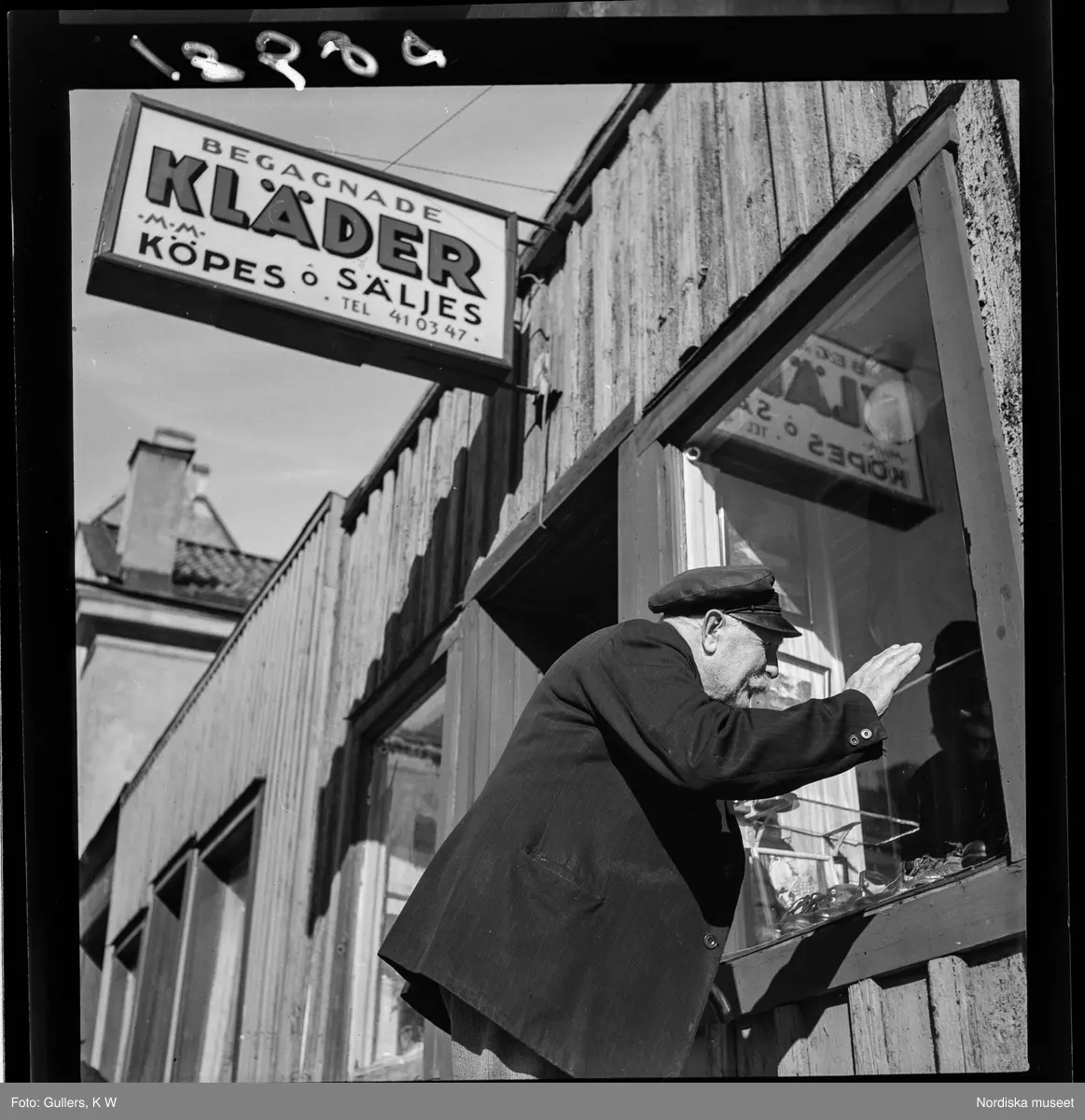 539 Söder. En man kikar in genpom skyltfönstret till en butik som köper och säljer begagnade kläder.