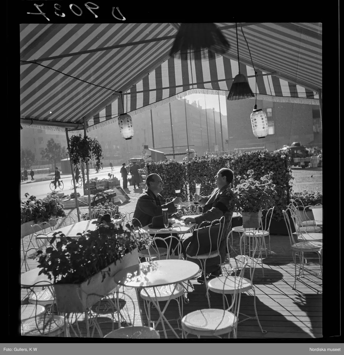 539 Söder. Två män sitter på en uteservering under randiga markiser och skålar i öl.