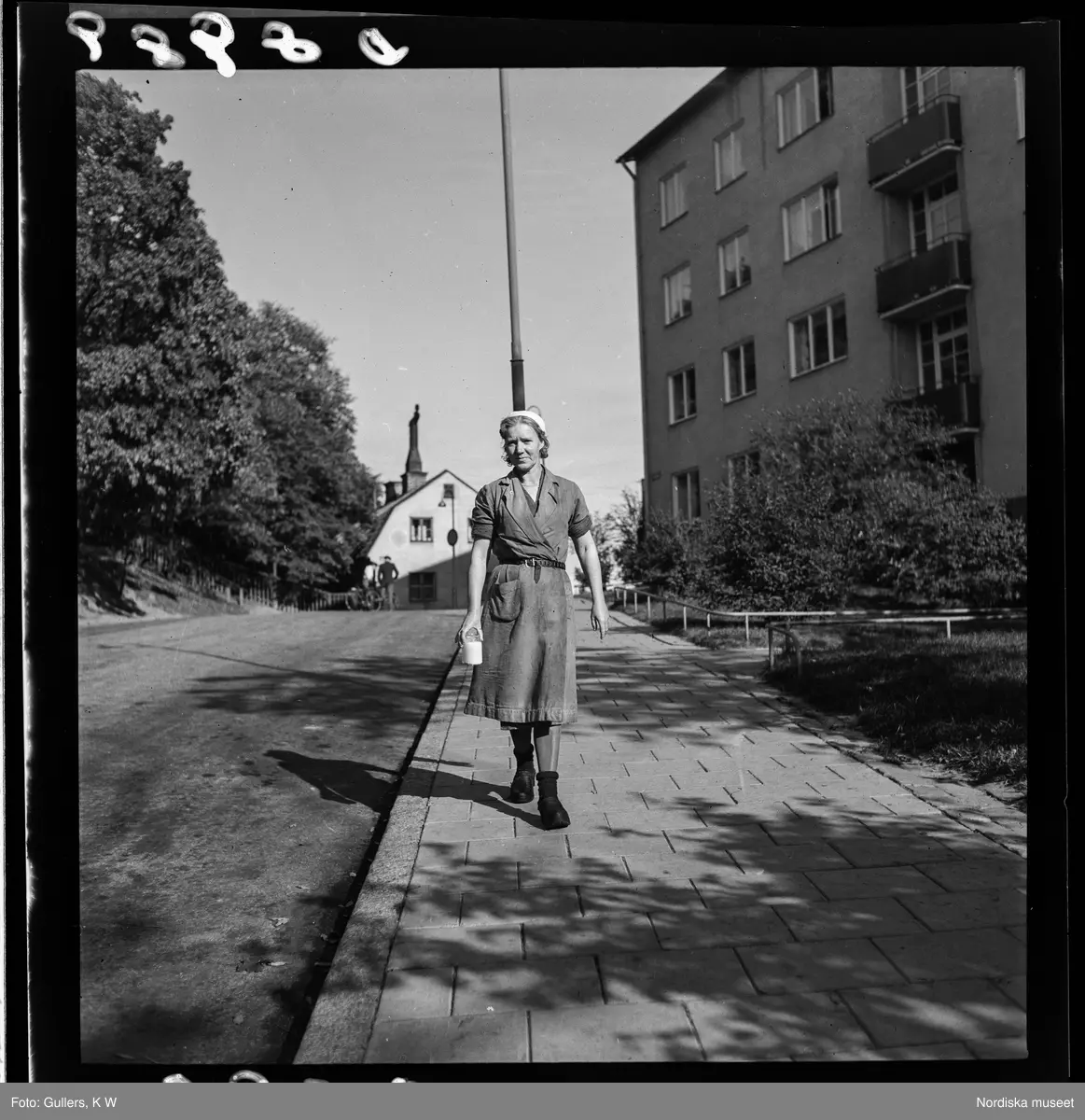539 Söder. En kvinna kommer gåendes med en burk (mjölk?) i handen.