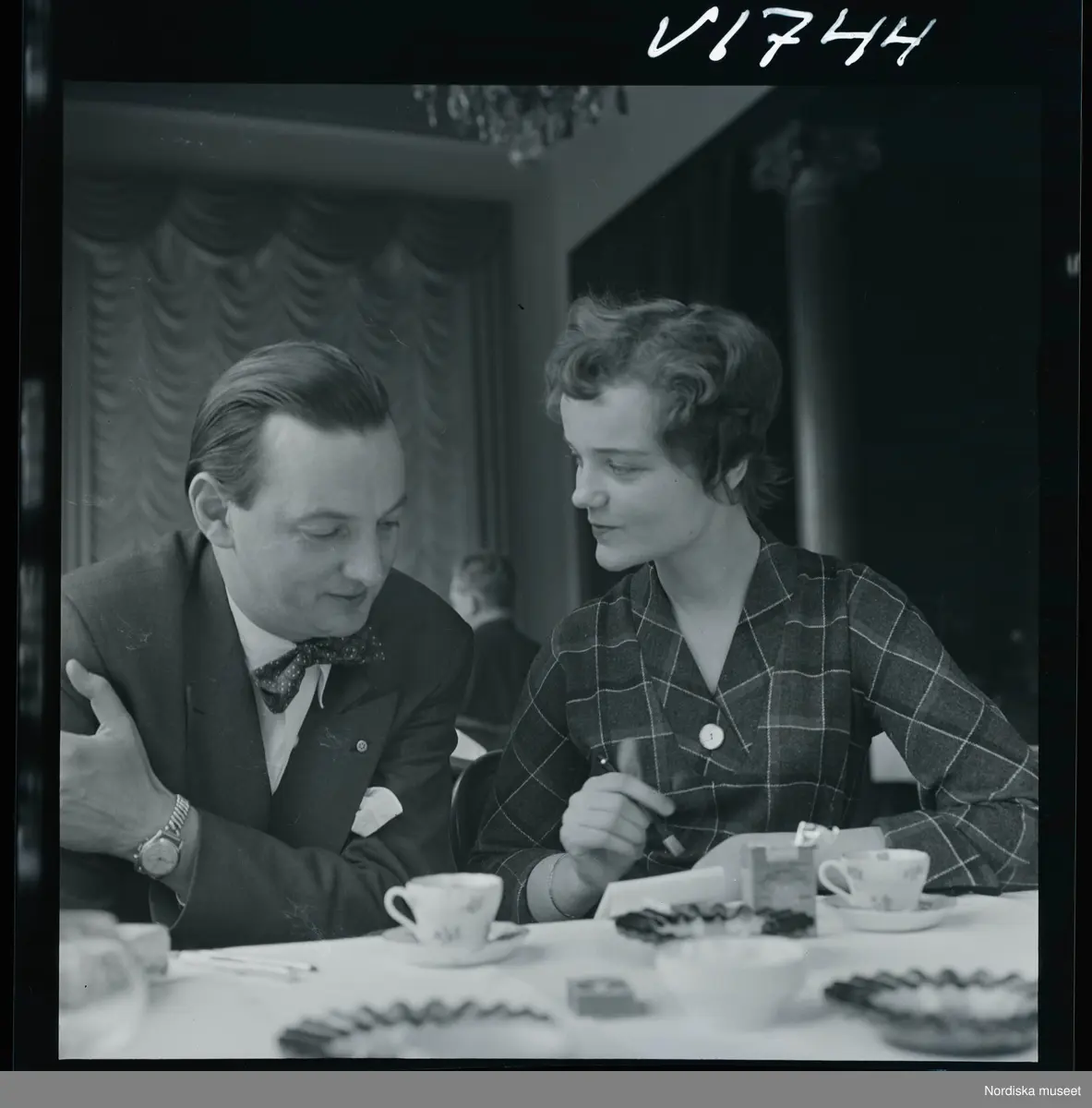 Fotograf K W Gullers och en kvinna sitter och samtalar, möjligtvis på restaurang/ café. På bordet framför dem står kaffekoppar och askfat.