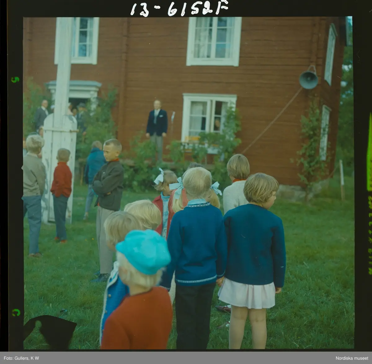 2773 B.M.W. Småland. En grupp barn på gräset framför en bygdegård eller liknande. Möjligen midsommar.