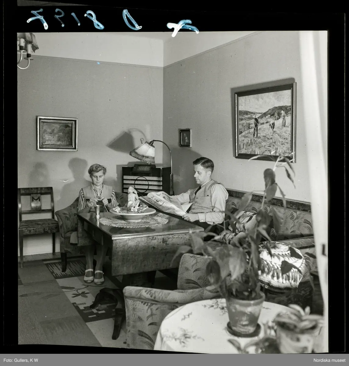 Journalist P. Wange läser hemma i soffan i sällskap av sin fru.