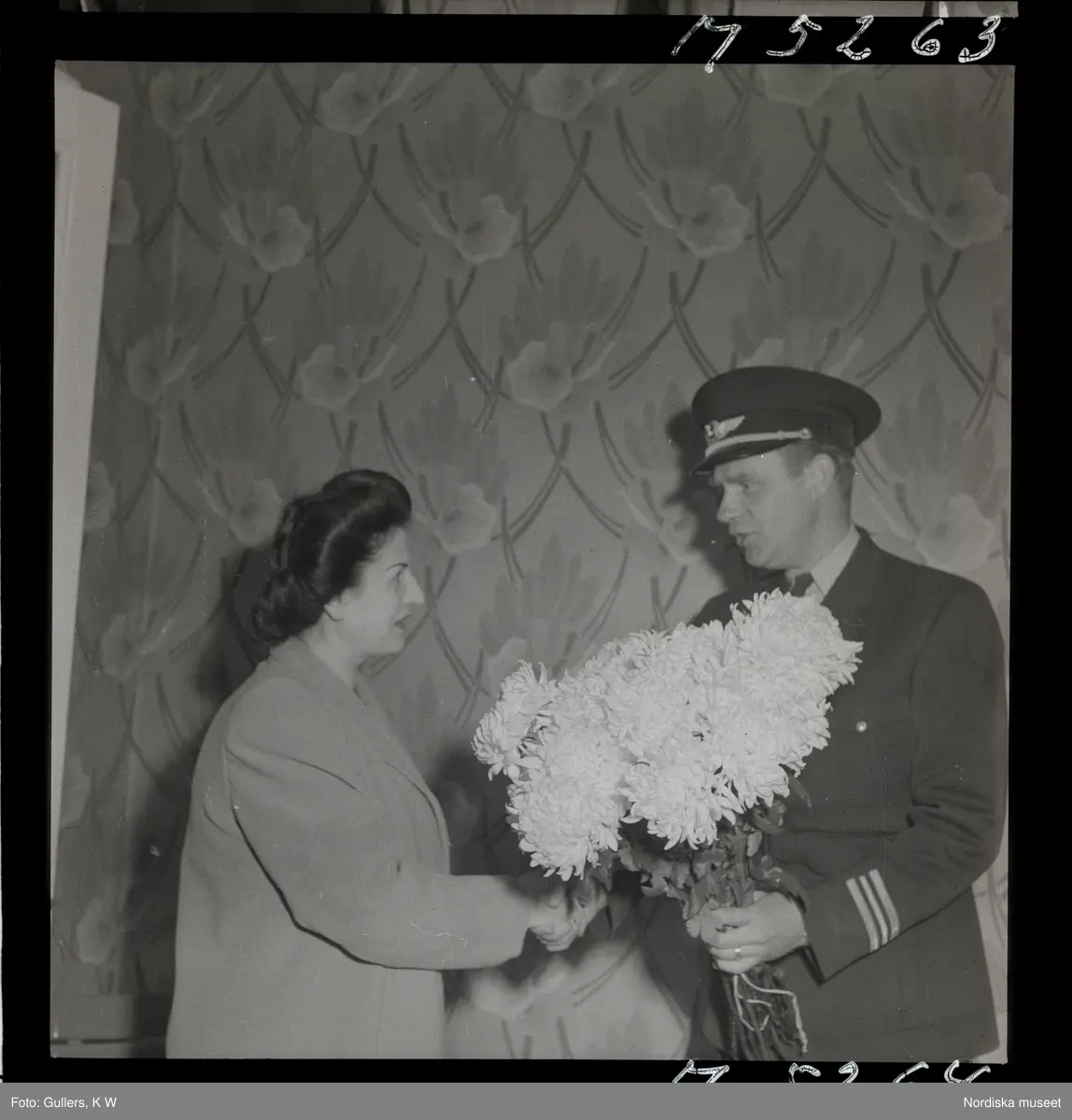 En man i uniform räcker en kvinna en blombukett.
