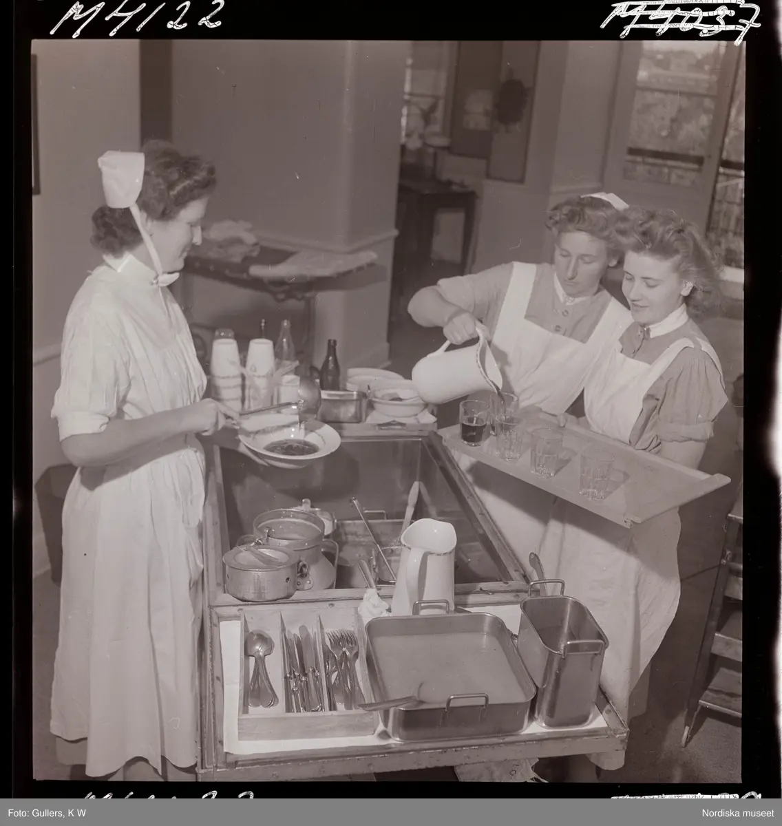 1711 En sjuksköterskas arbetsdag. Mat portioneras ut från en vagn.