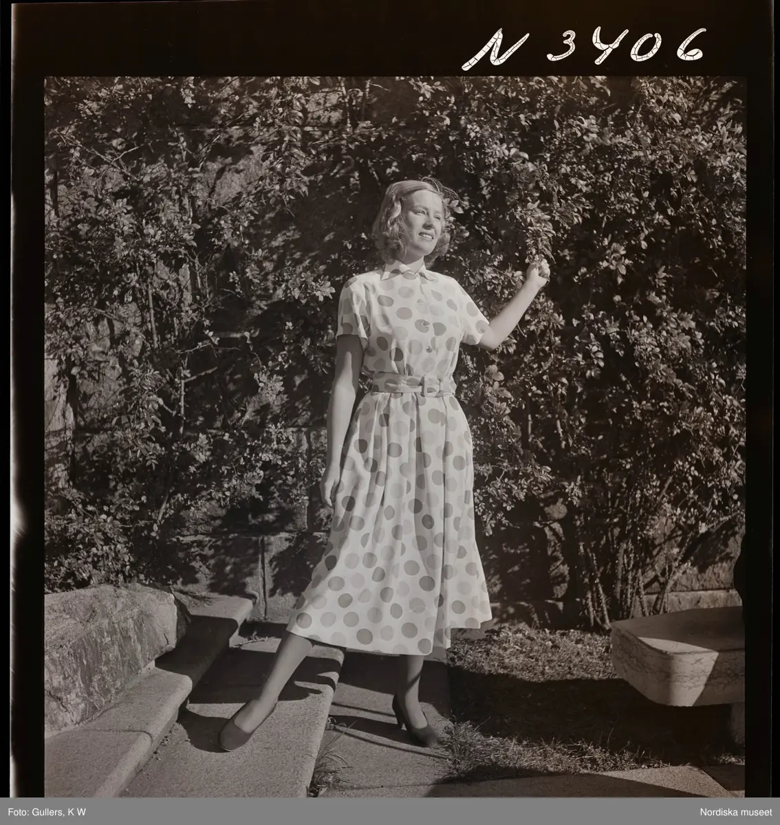 1708 N Mölnlycke väverier, mode; Stadshusträdgården, Stockholm; Mode för Mölnlycke. Modell i prickig klänning poserar utomhus.