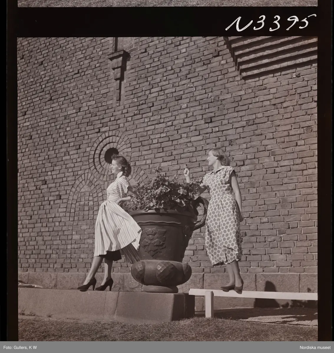 Titel: 1708 N Mölnlycke väverier, mode; Stadshusträdgården, Stockholm; Mode för Mölnlycke. Två modeller poserar vid stor urna framför Stadshuset.