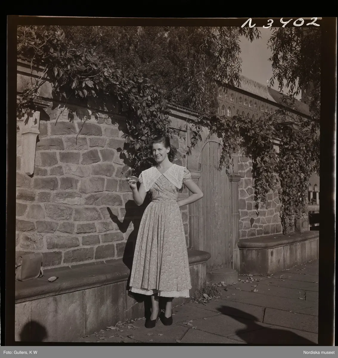 1708 N Mölnlycke väverier, mode; Stadshusträdgården, Stockholm; Mode för Mölnlycke. Modell i blommig klänning poserar vid mur.