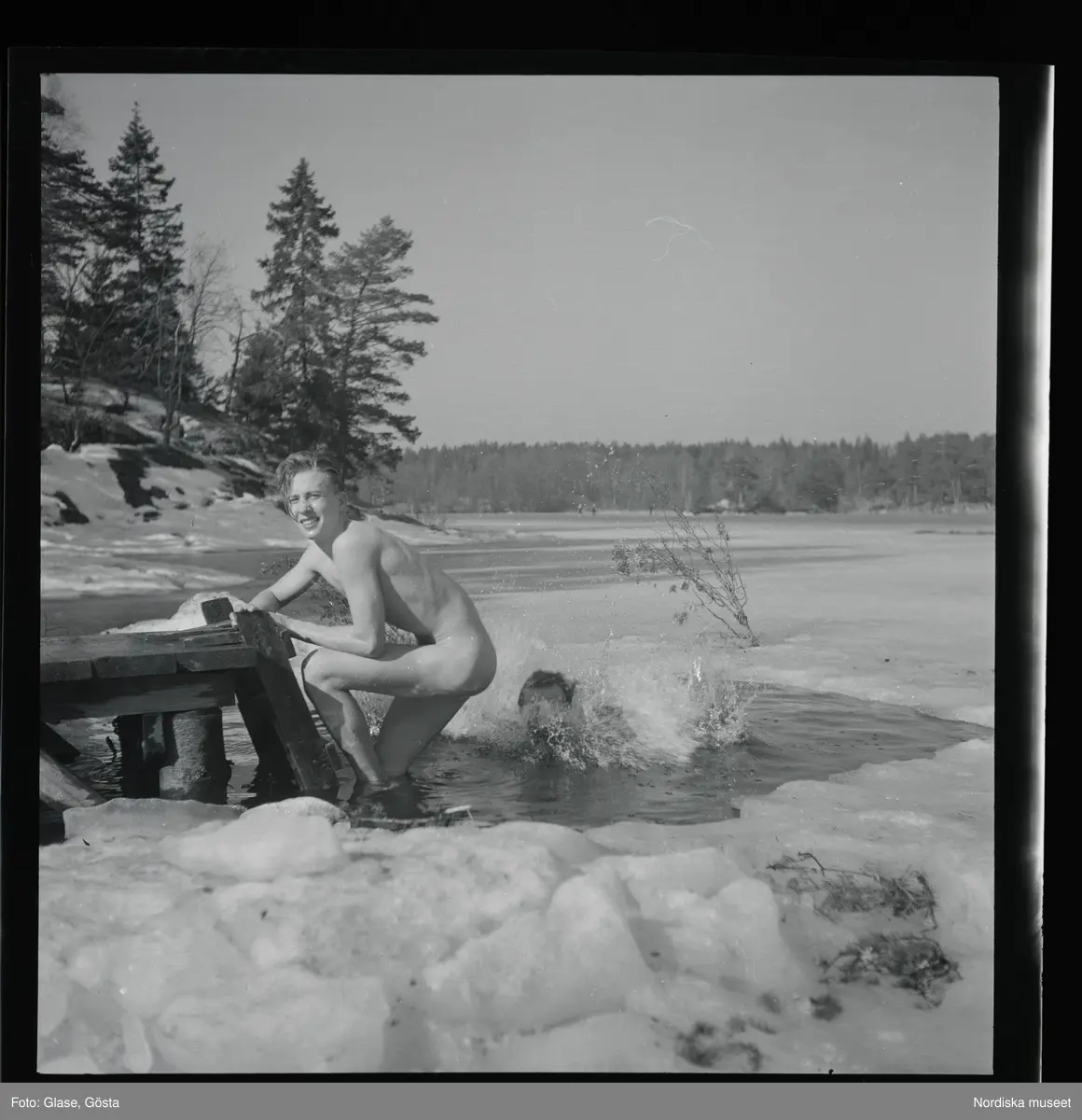 Hellasgården, Ringblom med fru på trappan samt skidåkaren Göte Andersson, 15-12-1944.