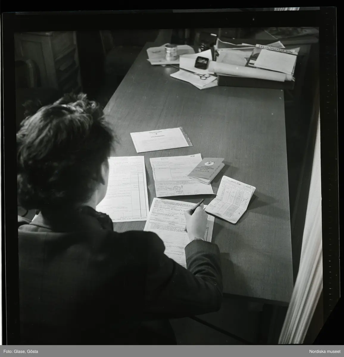 En kvinna sitter vid ett skrivbord med deklarationspapper framför sig.
