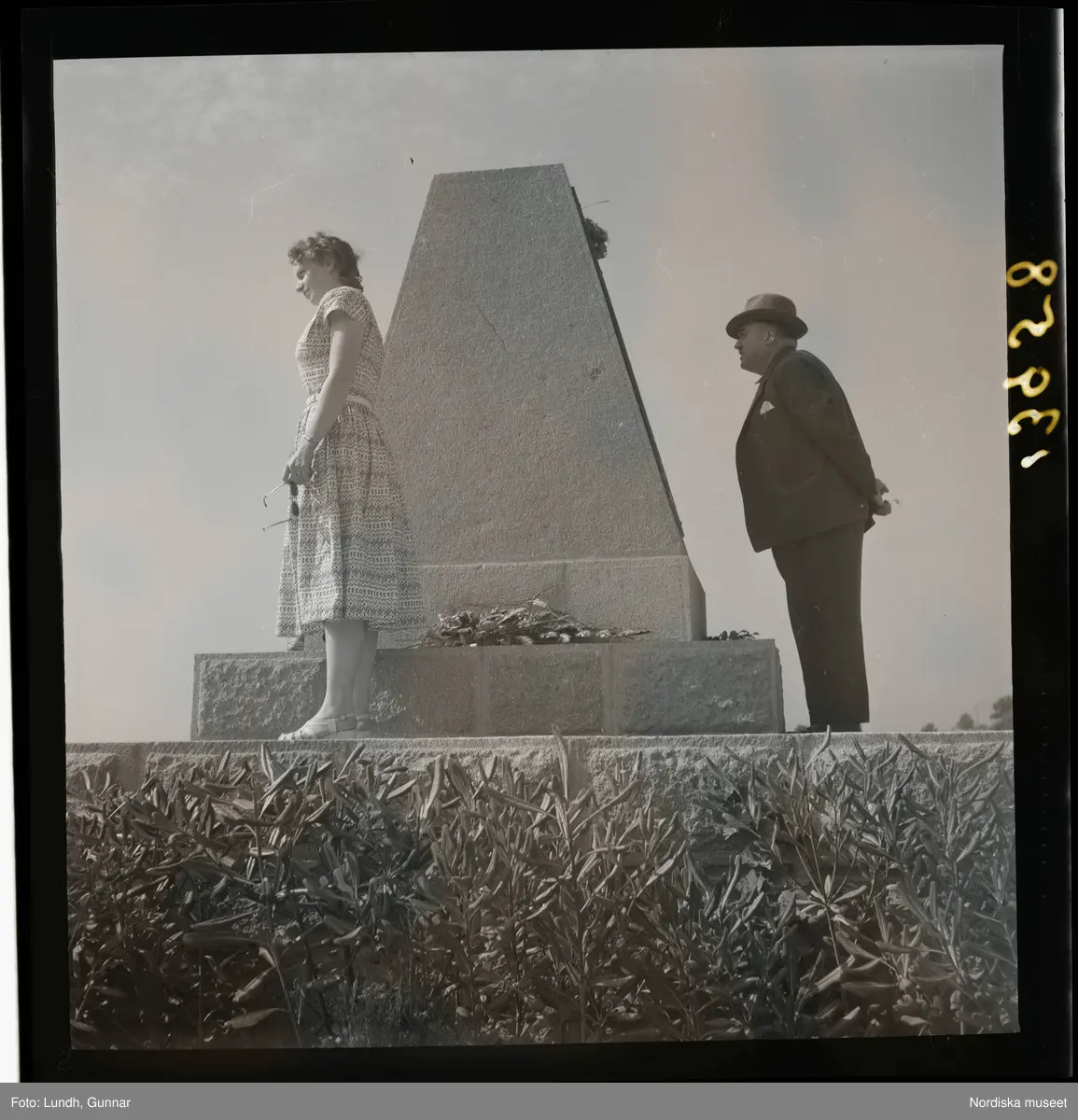 En man och en kvinna vid minnesmärke för omkomna under den allierade invasionen, med kodnamn Operation Dragoon, den 15 augusti 1944. Rivieran mellan Toulon och Cannes, Frankrike.