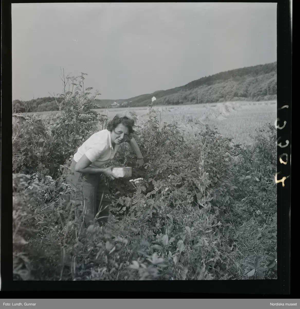 En kvinna plockar vildhallon i en liten spånflätad korg.