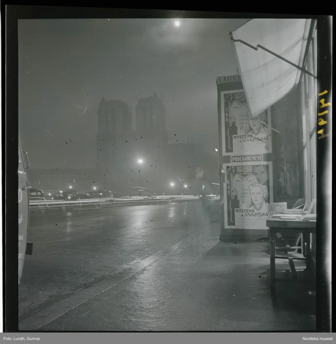 1950. Paris. Gata med Notre Dame i bakgrunden, kvällsbild.